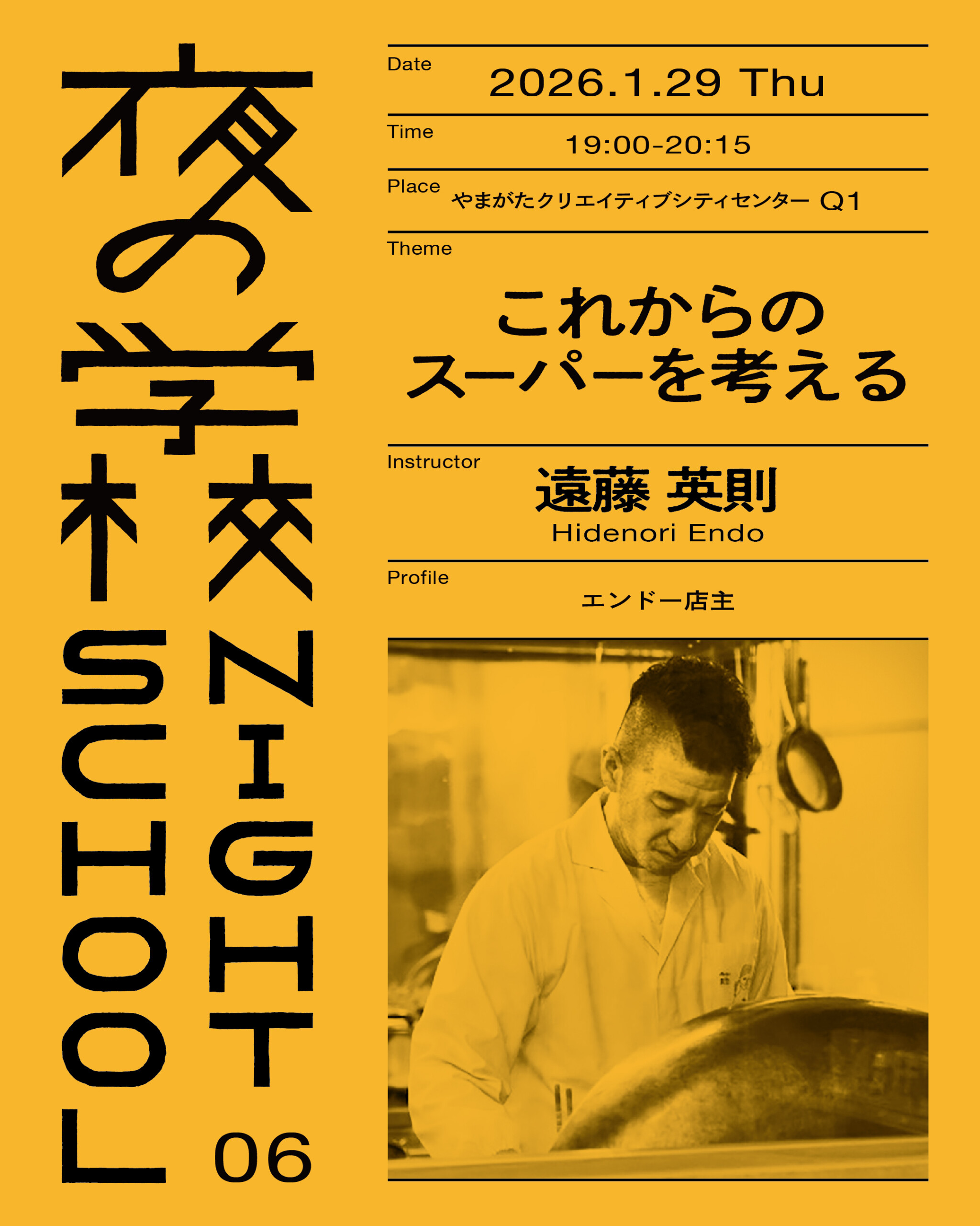 「夜の学校」は、クリエイティブをテーマとした、創造都市やまがたの市民学校です。なにかしらの研ぎ澄まされたスキルや優れた知恵やさまざまな得意技を持った方に先生としてご登壇いただき、生徒である私たち市民に授業をしていただく、という座学の時間です。先生となるのは山形の日常の中にふつうに暮らしている市民の方かもしれませんし、遠くからお呼びするゲストかもしれません。おいしい野菜をつくる技をもつ農家の方かもしれませんし、ある特定分野に大きな情熱を注いできたオタクのような人かもしれませんし、そのほか料理や音楽、文芸、スポーツといったさまざまな領域のさまざまな人でしょう。その方だけが持っている特異なスキルや知恵そしてクリエイティブの秘密を、山形市民である私たちに分けていただこうと思います。