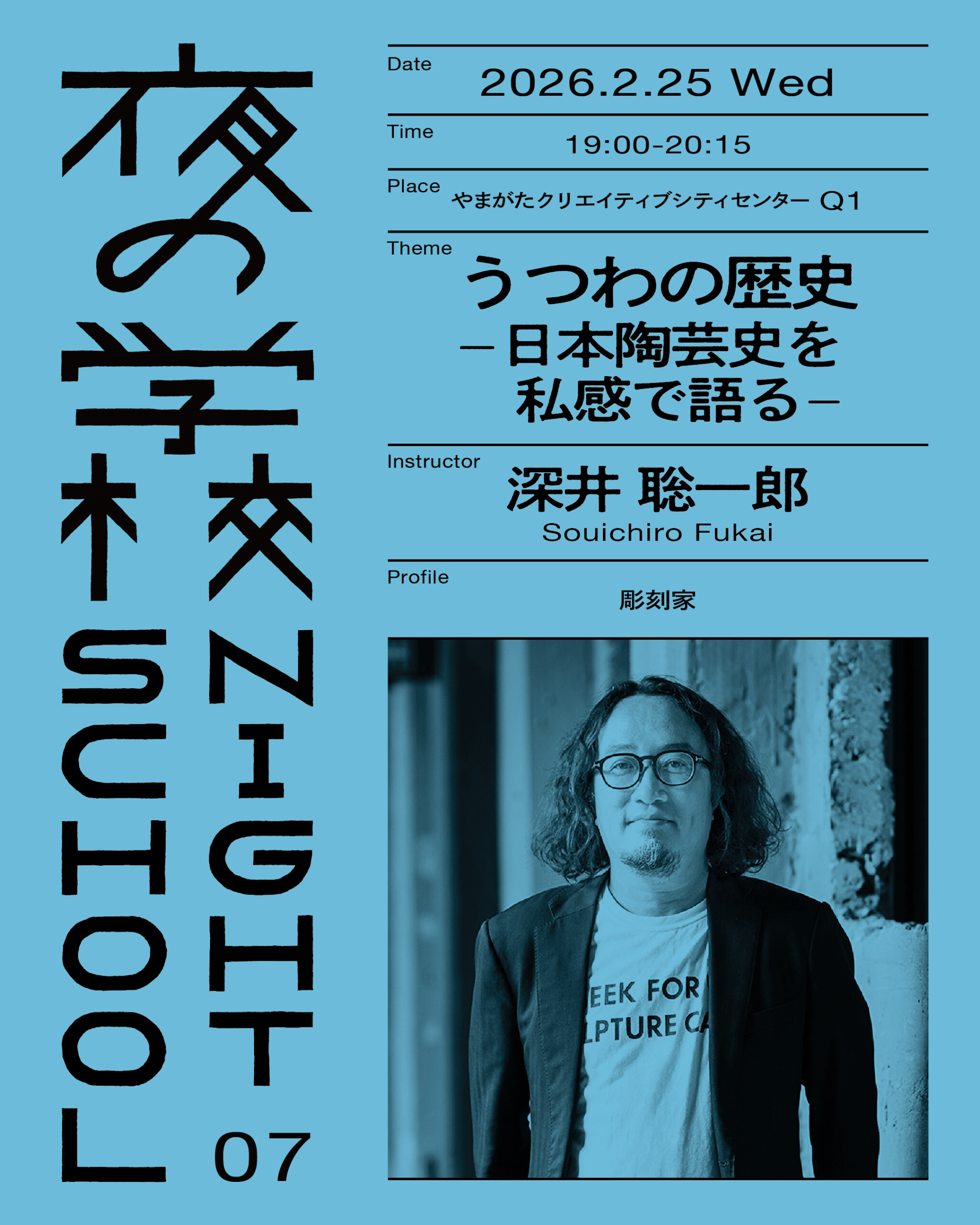 「夜の学校」は、クリエイティブをテーマとした、創造都市やまがたの市民学校です。なにかしらの研ぎ澄まされたスキルや優れた知恵やさまざまな得意技を持った方に先生としてご登壇いただき、生徒である私たち市民に授業をしていただく、という座学の時間です。先生となるのは山形の日常の中にふつうに暮らしている市民の方かもしれませんし、遠くからお呼びするゲストかもしれません。おいしい野菜をつくる技をもつ農家の方かもしれませんし、ある特定分野に大きな情熱を注いできたオタクのような人かもしれませんし、そのほか料理や音楽、文芸、スポーツといったさまざまな領域のさまざまな人でしょう。その方だけが持っている特異なスキルや知恵そしてクリエイティブの秘密を、山形市民である私たちに分けていただこうと思います。