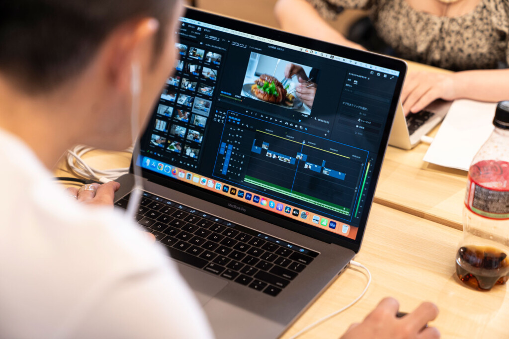 編集編ではまず、使用する編集ソフトについての基本的な説明がありました。今回の参加者たちは、あらかじめDaVinci Resolve またはAdobe Premiere Pro という編集ソフトをインストロールしたPCを持ち込んで参加しています。編集ソフトの画面をみんなで見ながら、素材のインポートからタイムラインへの配置、映像のトリミング、BGMの挿入や音調整、といった基本操作について学んでいきました。その後は各自、前日に撮影した映像を素材として編集作業を進めていきます。